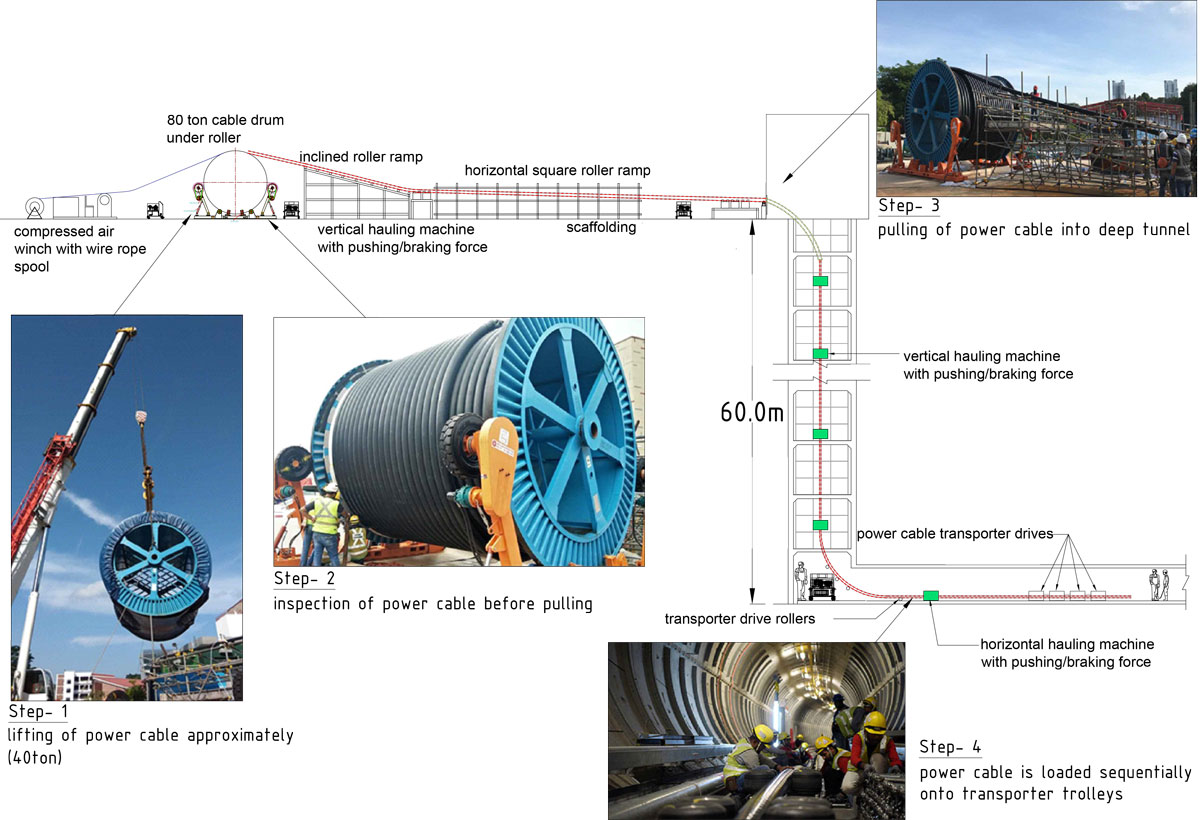 The following diagram illustrates the power cable installation process (i) from spooling out a cable from ground level to pulling such power cable to entering the underground tunnel; (ii) from vertically pulling such cable from the tunnel entrance to the designated underground tunnel section of approximately 60 metres underground.